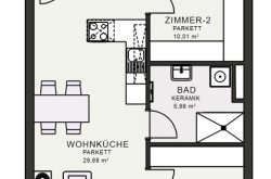 Die Wohnungen bieten hochwertige Ausstattungsdetails wie Parkett- oder Keramikböden, maßgefertigte Einbauküchen, Fußbodenheizung über Fernwärme, eigene Kellerabteile sowie private Außenflächen in Form von Balkonen oder Gärten. Sämtliche Einheiten sind barrierefrei über Aufzüge oder überdachte Erschließungswege zugänglich.
