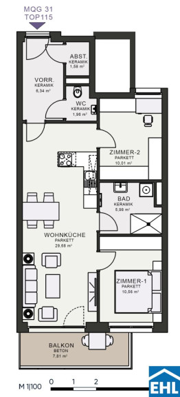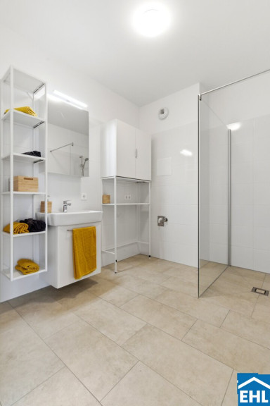 Fliesen, Parkett, Fußbodenheizung, Wohnküche / offene Küche, Personenaufzug, Dusche