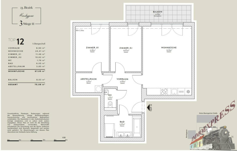 Nutzfläche: 67,05 m² Wohnfläche + 8,03 m² Balkone + 3,26 m² Kellerabteil