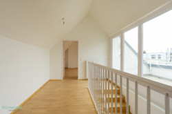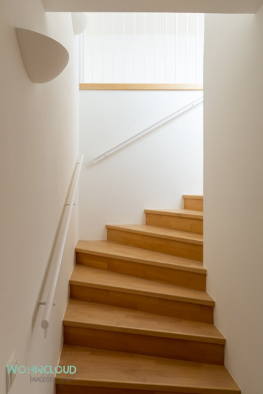 Vom Vorraum führt eine wunderschöne, helle Holztreppe in das Obergeschoß. Hier oben sind zwei weitere Schlafzimmer untergebracht, ein vollausgestattetes Badezimmer und die große südwestliche Traumterrasse.