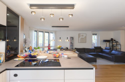 Wohnzimmer mit angrenzender Einbauküche und Zugang zur 1. Loggia und dem Garten, separates WC, Abstellraum Vorzimmer,