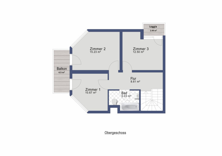 3 zentral begehbare Schlafzimmer mit Zugang zur 2. Loggia und dem Balkon, Bad mit Wanne, Dusche und WC, Vorzimmer,