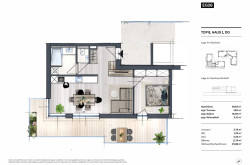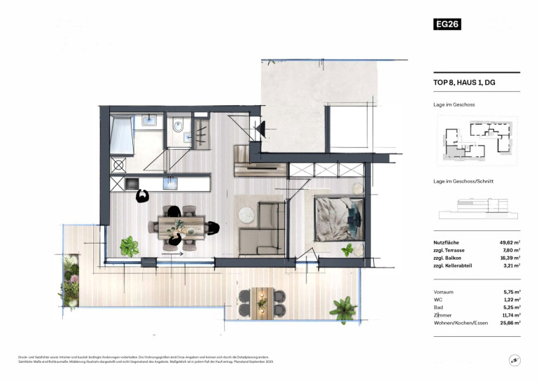 Vorraum, Wohnküche (ca. 25,66 m²), Abstellraum, Zimmer (ca. 11,74 m²), Badezimmer mit Dusche, WC, Balkon (ca. 16,39 m²), Terrasse (ca. 7,80 m²), Keller