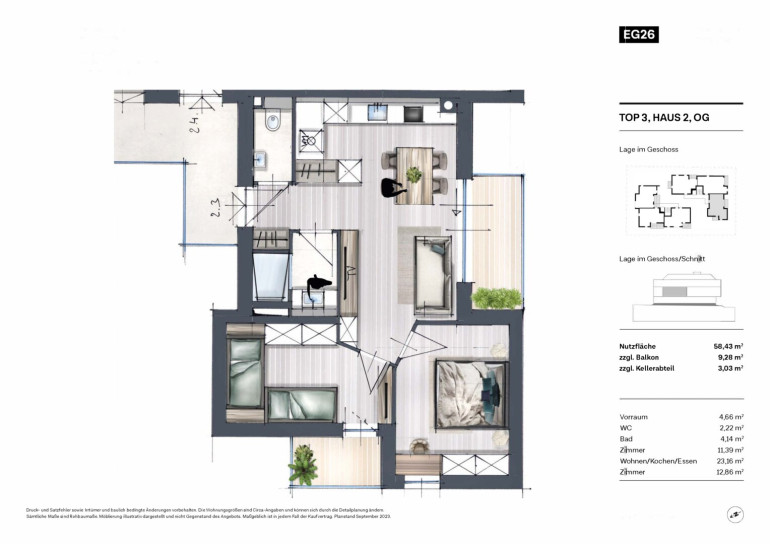 Vorraum, Wohnküche (ca. 23,16 m²), Abstellraum, 2 Zimmer, Badezimmer mit Dusche, WC, Balkon, Keller