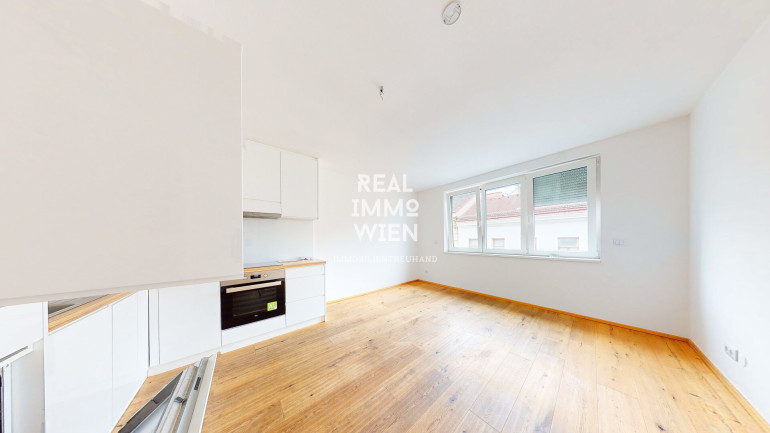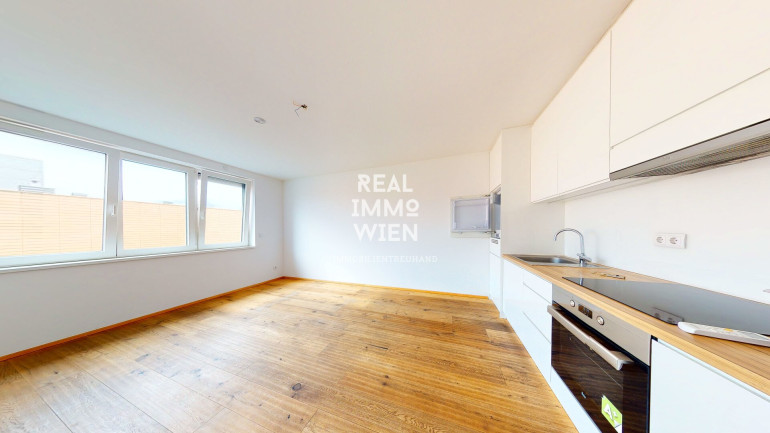 Die Wohnung überzeugt durch eine hochmoderne Einbauküche, qualitativ hochwertige Parkettböden sowie stilvoll verflieste Sanitärräume.