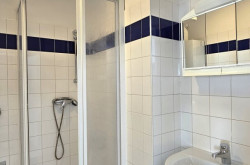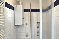 - Badezimmer mit Dusche, Handwaschbecken, Waschmaschinenanschluss, Handtuchtrockner