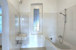 - Badezimmer mit Wanne, Handwaschbecken und Waschmaschinenanschluss