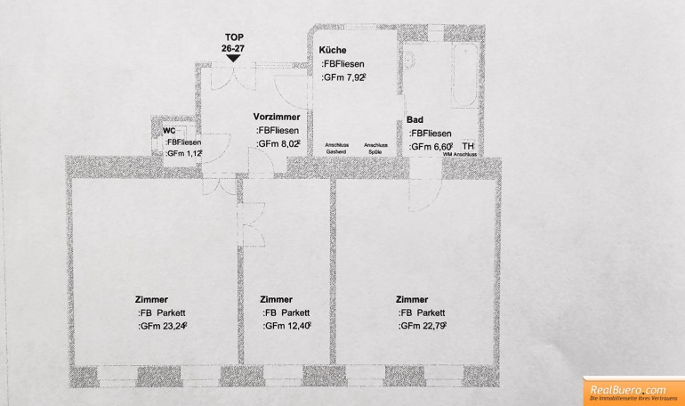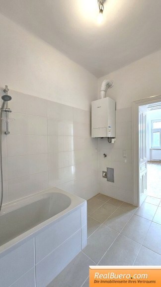 - Küche leer bis auf die Anschlüsse (der Mieter bekommt als Ersatz für Spüle und Herd € 350.-)