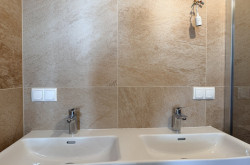 - Vollständig verfliestes Badezimmer (bis zur Decke verfliest)