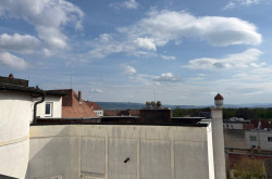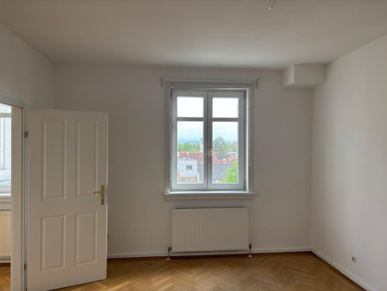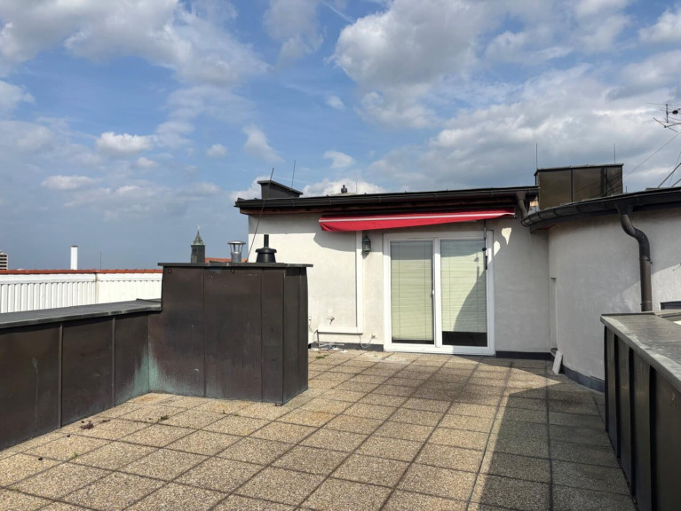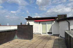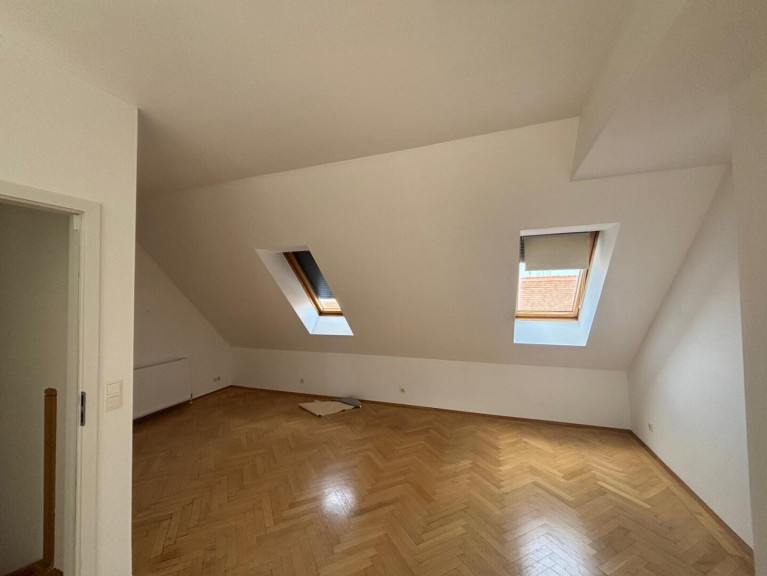Über eine innenliegende Treppe gelangt man in die obere Ebene mit einem weiteren Zimmer, einem Badezimmer mit WC und Dusche sowie dem absoluten Highlight der Wohnung: einer riesigen Dachterrasse mit rund 49,70 m². Von hier aus genießt man einen Fernblick bis ins Gebirge — perfekt für schöne Sommerabende mit Freunden oder der Familie.
