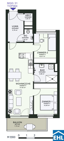 Fliesen, Parkett, Fußbodenheizung, Wohnküche / offene Küche, Personenaufzug, Dusche