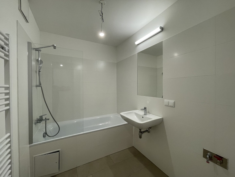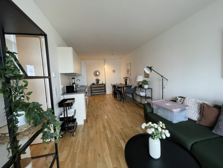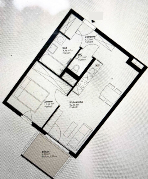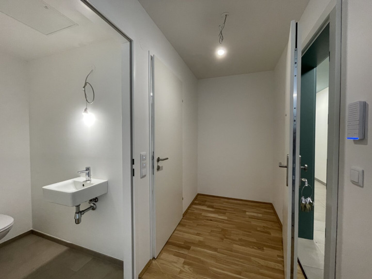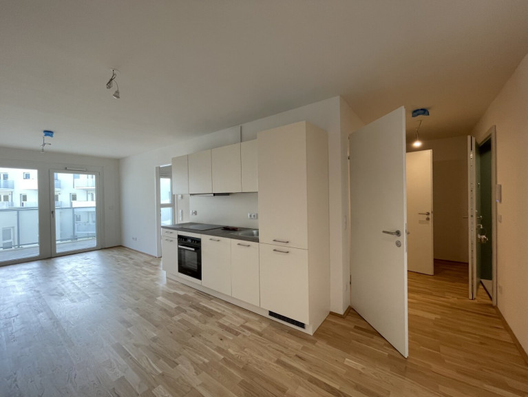 Beim Betreten der Wohnung gelangen Sie durch die Eingangstür in einen einladenden Flur. Direkt gegenüber befindet sich das Badezimmer mit einer Badewanne, einem Waschbecken und einem Waschmaschinenanschluss sowie ein separat liegendes WC inkl. Handwaschbecken. Folgt man dem Flur, gelangen Sie in den geräumigen Wohnbereich, der eine offene Wohnküche umfasst. Die Küche ist mit modernen Geräten ausgestattet und bietet Ihnen alles, was Sie für den täglichen Gebrauch benötigen. Von hier aus haben Sie Zugang zu dem gemütlichen Balkon mit Blick in den Innenhof! Eine weitere Tür im Wohnbereich führt Sie in das abgetrennte Schlafzimmer.