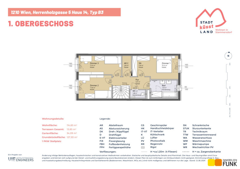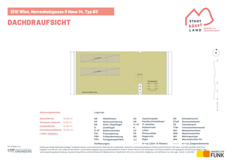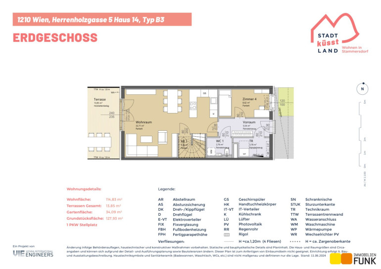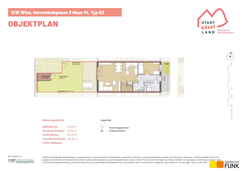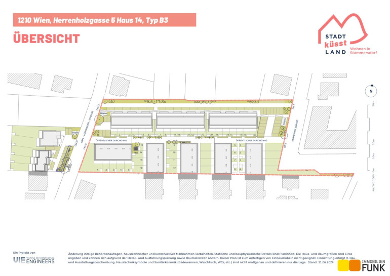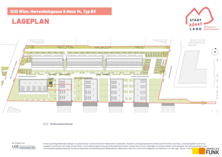 Das Reihenhaus 14 befindet sich in der Herrenholzgasse 5, 1210 Wien und wird auf einem ca. 128 m² großen Eigengrund errichtet. Seinen künftigen Bewohnern bietet es zudem eine komfortable Wohnfläche im Ausmaß von insgesamt ca. 114 m², angeordnet auf zwei Geschoßen mit 5 Zimmern, 2 Toiletten, einem großen Badezimmer, dem Technikraum und zwei Abstellräumen, sowie einer westseitig ausgerichteten Terrasse mit ca. 13 m², die sich zu einem gemütlichen Gartenbereich mit ca. 34 m² öffnet. Diesem Reihenhaus ist ein Parkplatz in der Nähe des Objekts zugewiesen. Der Kaufpreis für den KFZ-Platz beträgt 19.000,00 € .