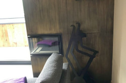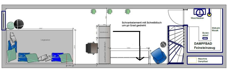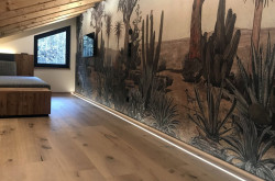 Über die beleuchtete Wendeltreppe gelangt man in der DG 2. Hier befindet sich das 2. Schlafzimmer / Kinderzimmer / Gästezimmer / Büro bzw. Wellness-Bereich mit Dampfbad und integriertem Badezimmer. Je nach Stimmung kann man das Dampfbad mit Farb- oder Duftvariationen genießen. Für die Garderobenelemente, der integrierte Schreibtisch und das Wohlfühlbett in Übergröße wurde hier braunes Altholz gewählt. Zahlreiche, integrierte Laden bieten Stauraum pur. Für die perfekte Erfrischung sorgt die versteckte Minibar. Die Wüstenlandschaft - die Antithese zur beschneiten Gebirgslandschaft - fügt sich harmonisch ein und sorgt für ein behagliches Entspannungsgefühl nach dem Gang ins Dampfbad.
