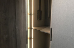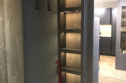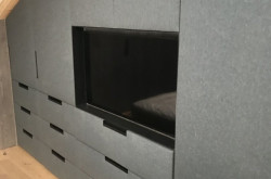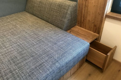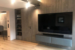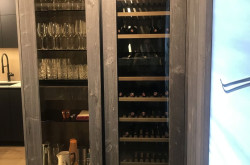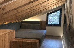 Das Dachgeschoß-Top wurde auf beiden Ebenen von einheimischen Tischlern und Innenausstattern mit edlen, grauen bzw. braunen Altholz-Elementen in Kombination mit Loden veredelt. Die Altholz-Türen mit schwarzen Beschlägen fügen sich harmonisch in die Altholz-Fronten ein. Die Tischlermaßküche wurde ebenso in die Gesamtkonzeption integriert und besteht zu einem Teil aus Altholz. Der bodengleiche Weinkühlschrank und die mit LED-beleuchtete Glasvitrine mit ausziehbarem Board bieten alles, was man für einen gemütlichen Abend mit Freunden benötigt.