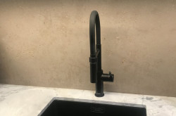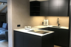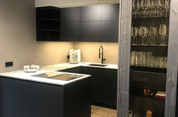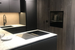 Die Küche mit ihren hochwertigen Markengeräten - Bora, Liebherr und Bosch - erfreut Profi- wie Hobbyköche gleichermaßen. Mit dem Bora-Dampfgarer mit integriertem Backrohr - empfohlen von Starköchen - können Sie zu Hause auf Sterneniveau kochen. Mit dem Teppan Yaki, dem Luxusgut unter den Küchengeräten, können Sie Fisch, Fleisch und Gemüse knackig anbraten – ähnlich wie beim Profi im Restaurant. Der Bora-Abzog sorgt dabei für gefilterte Luft. Die Speis - Abstellraum mit Altholz-Schiebetüre - bietet ausreichend Stauraum, auch für die darin befindliche Waschmaschine. Die Arbeitsplatte aus Naturstein und die Wände aus Terrastone-Steinputz verleihen der Küche eine ganz besondere Atmosphäre und komplettieren die edle Anmutung.
