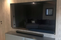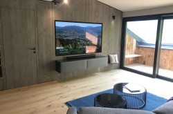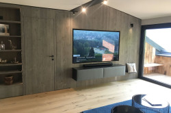 Der große LG-Fernseher (185 cm x 100 cm) mit Sonos-Soundbar und Hängeregal aus Metall mit Lodenbezug fügt sich perfekt in die Altholzwand ein und bietet ein außergewöhnliches Kinoerlebnis. Die große, gemütliche Rolf Benz-Couch, die edel-anmutenden, gehobelten Eichendielenböden in den Wohnräumen mit integrierter Fußbodenheizung und der schöne Blick auf den offenen Kamin schaffen ein wohliges Wohnfühlgefühl an kalten Tagen.