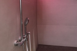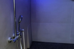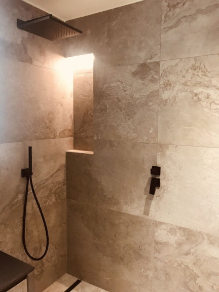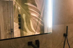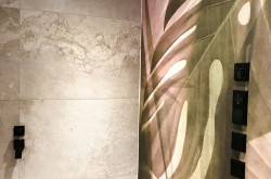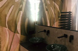 - Badezimmer mit Doppelwaschbecken, bodengleicher Dusche mit Rainshower, Ital. Armaturen und floraler Wandgestaltung