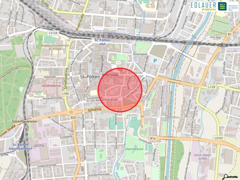 Die Wohnung ist im Zentrum von St. Pölten, nur wenige Gehminuten vom Herrenplatz entfernt situiert. In der Fußgängerzone finden sich diverse Einkaufsmöglichkeiten, Restaurants, Ärzte, und Freizeitangebote in fußläufiger Entfernung. Für Pendler ist auch die Nähe zum Hauptbahnhof sehr von Vorteil.