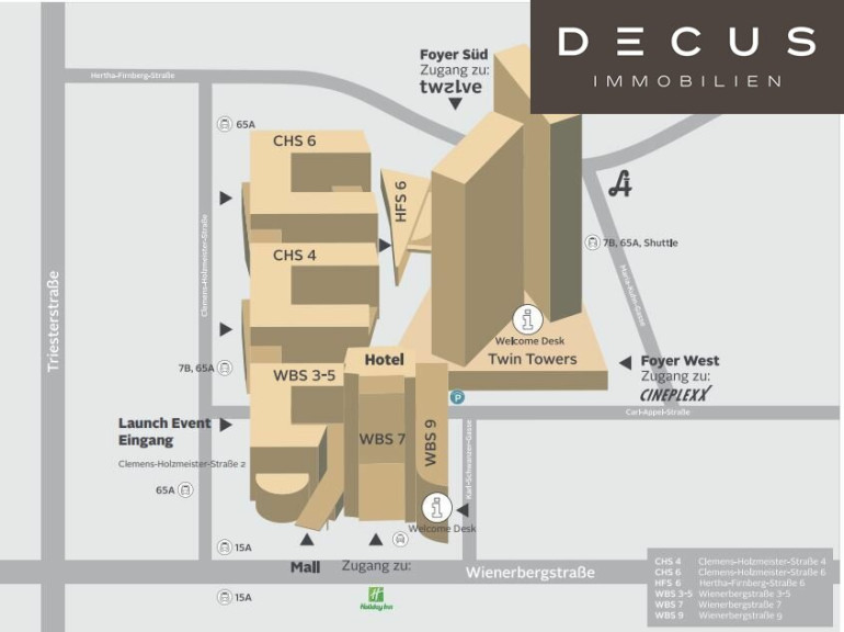 Mit dem PKW gelangen Sie über die Südeinfahrt in die Wienerberg City, beste Anbindung an den individuellen Straßenverkehr zur A2, Flughafen und in Kürze in die Innenstadt.