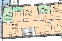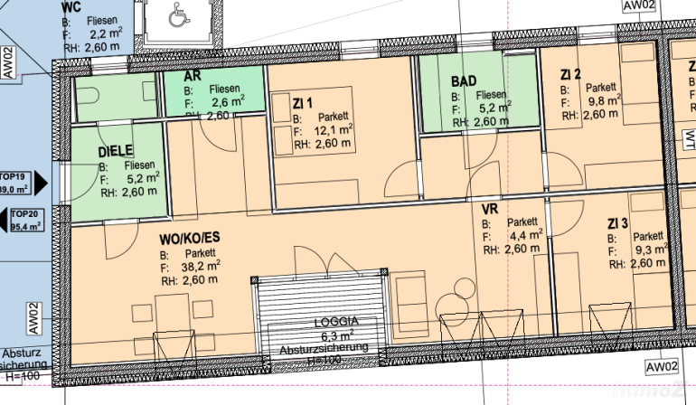 Die Top 19 teilt sich wie folgt auf: Diele, Bad, WC, AR, Wohn/Kochen/Essen mit ca. 38,2 m2 und Zugang zur Loggia, sowie 3 extra Zimmer.