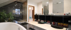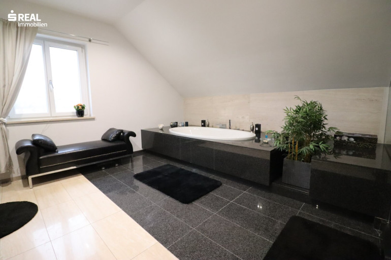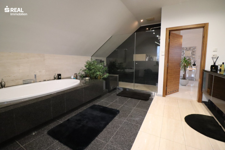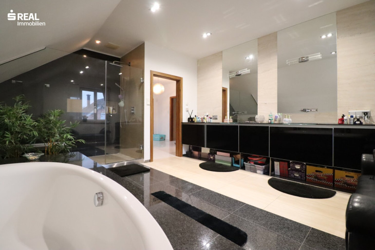 + luxuriöses Badezimmer mit geräumiger Walk-In Dusche, riesiger Badewanne und zwei Waschbecken