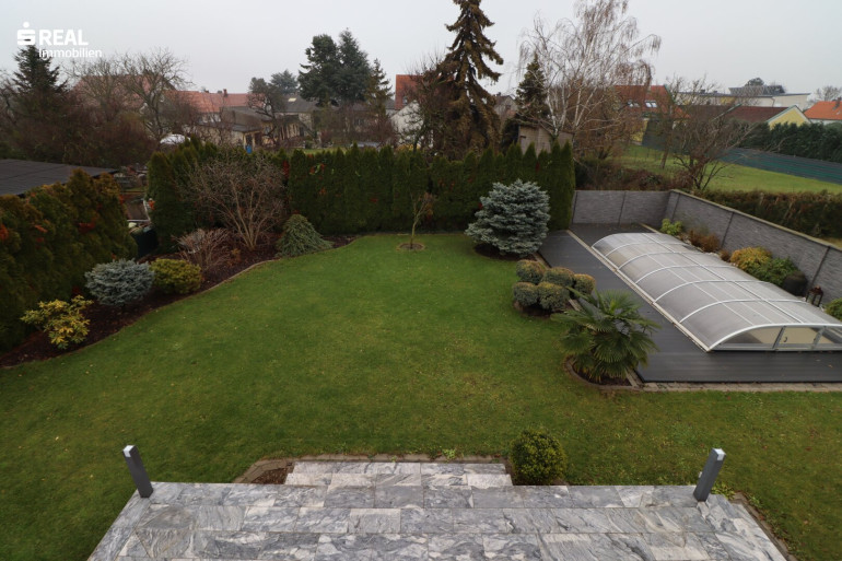 Der uneinsehbare Garten mit dem einladenden Pool mit Überdachung bildet eine idyllische Ruheoase, die absolute Privatsphäre und Erholung garantiert.