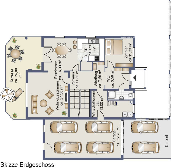 Die geräumige Garage mit etwa 52,7 m² bietet Platz für mehrere Fahrzeuge und genügend Stauraum.