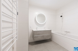 - Hochwertige, einfarbige Wand- und Bodenfliesen in den Nassräumen (Format 60x30)