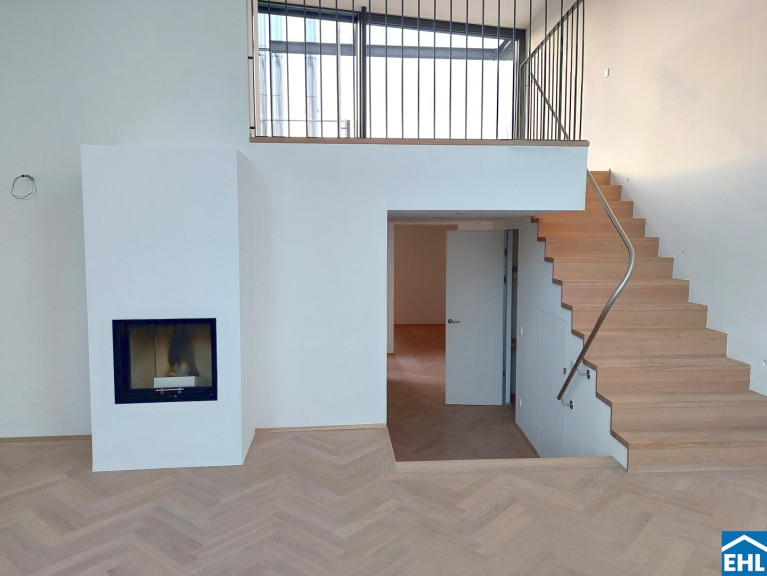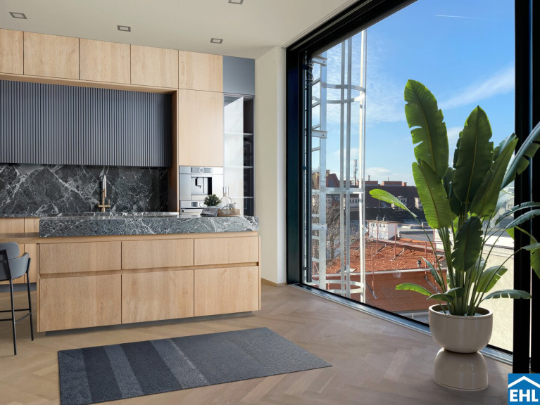 Über eine elegante Treppe erreichen Sie das Herzstück der Wohnung: die offen gestaltete Wohnküche. Lichtdurchflutet, weitläufig und stilvoll – dieser Raum lädt zum gemeinsamen Kochen, Lachen und Genießen ein. Die großflächigen Hebe-Schiebetüren führen auf ein echtes Highlight: eine fast 50 m² große Terrasse mit spektakulärem Ausblick über Wien bis hin zum Kahlenberg. Ob Sonnenaufgang beim Frühstück oder Sundowner mit Freunden – dieser Ort wird zum Lieblingsplatz über den Dächern der Stadt.