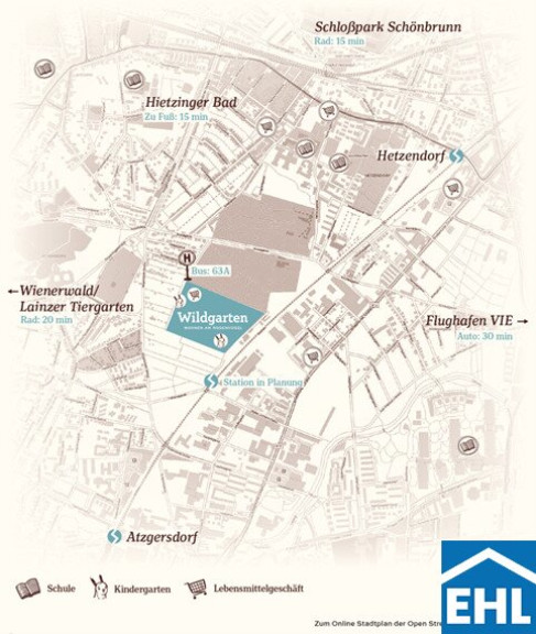 Vom und zum Wildgarten fährt man mit dem Bus (63A, zukünftig auch 63B) der eigens für den Wildgarten eine neue Haltestelle bekommen wird. Der Bus bringt Sie zum Bahnhof Hetzendorf oder Bahnhof Atzgersdorf mit den Schnellverbindungen der S-Bahn. Mit dem Fahrrad benötigen Sie ca. 20 Minuten in den Wienerwald bzw. Lainzer Tiergarten, oder Sie sind zu Fuß in ca. 15 Minuten im Hietzinger Bad. Den Flughafen erreicht man mit dem Auto in ca. 25 Minuten. Das Zentrum Wiens ist in ca. 30 Minuten erreicht und doch sind Grünflächen und Freizeitangebote in unmittelbarer Umgebung. Das bietet die Lage des WILDGARTENs.