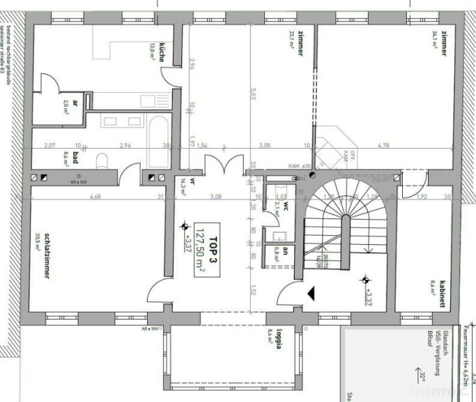 Es handelt sich hierbei um eine perfekt aufgeteilte, sonnige Wohnung mit 3 Zimmer inkl. Küche und 127,50 m² Wohnfläche + 8,60 m² Loggia im 1.Stock.