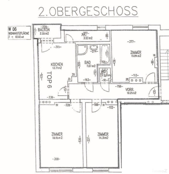 Wohnungsgröße von ca. 87,28 m2 mit Vorraum, extra WC, großes Bad mit Dusche und Wanne, Küche möbliert (extra Raum) mit Zugang zur Loggia und Abstellraum, 3 extra Zimmer.
