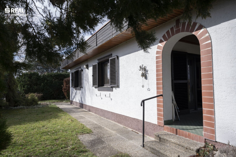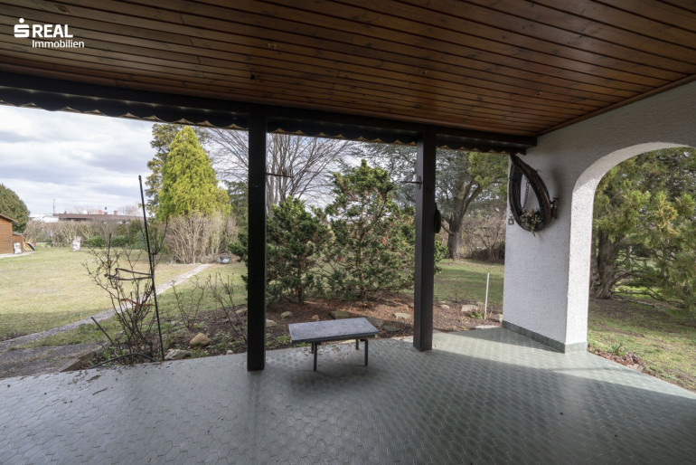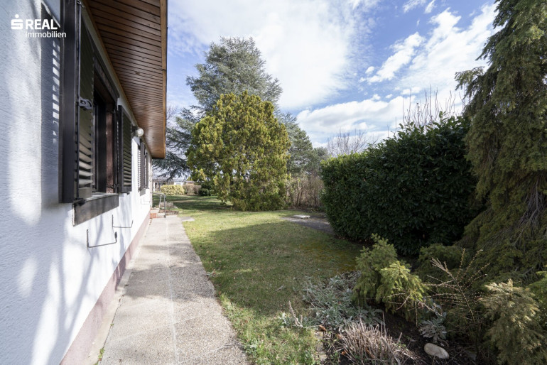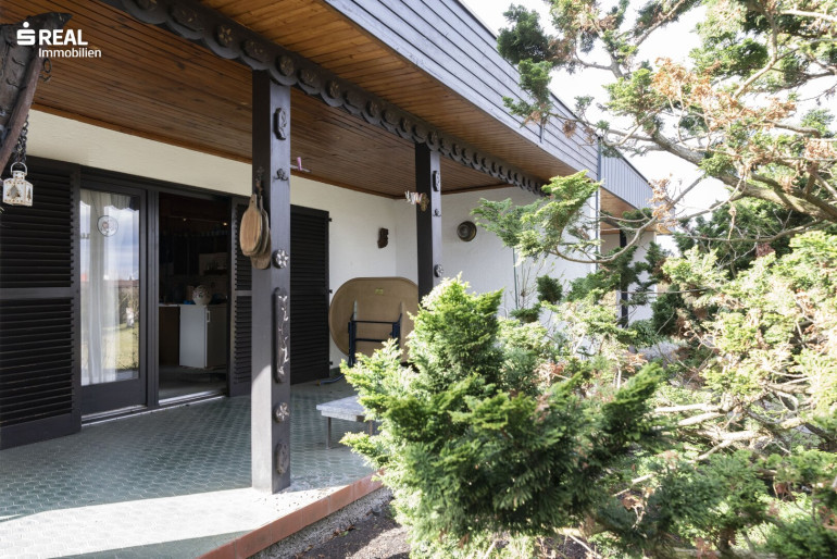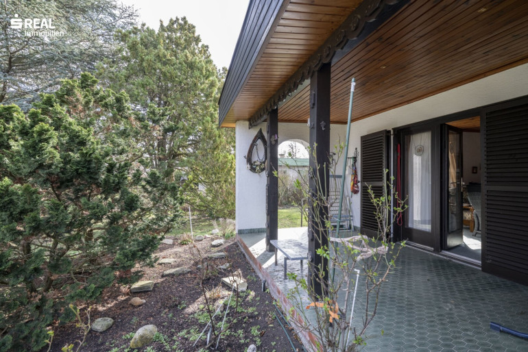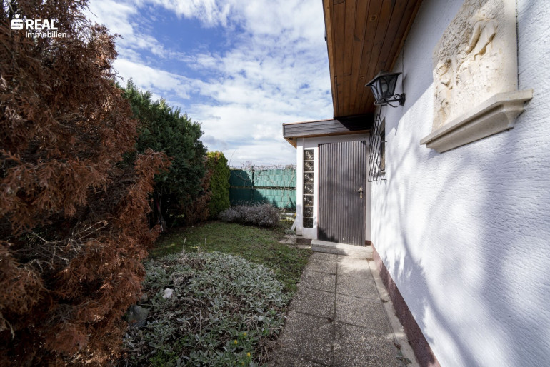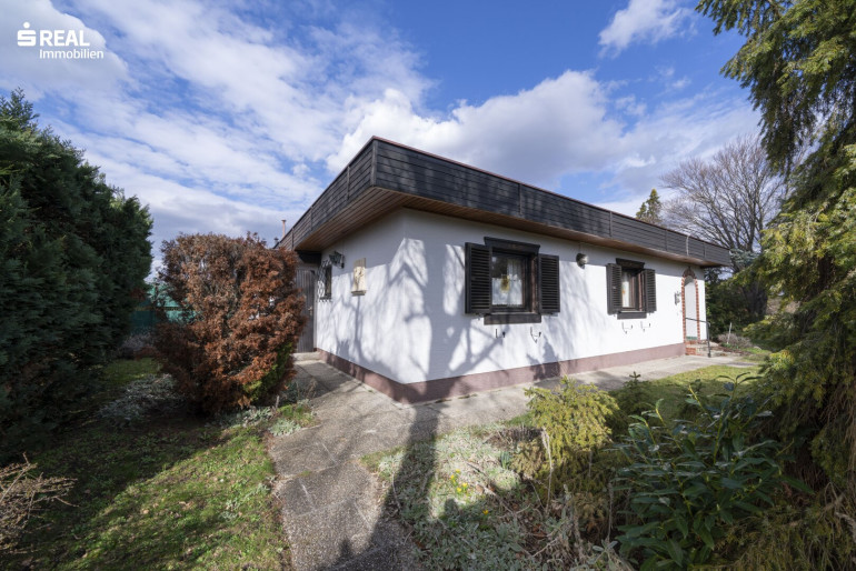 Ein Carport ist zu Beginn des Grundstückes situiert, gepflegte Gehwege führen vorbei, an Abstellraum, einer Außenterrasse und der überdachten Terrasse beim Eingangsbereich. Über die zweiflügelige Terrassentüre mit Außenholzläden, ist der Bungalow erreichbar und eröffnet den Wohn-/Küchenbereich mit Essplatz, gefolgt von einem Flur, vorbei am Badezimmer und dem Zugang zum Schlafzimmer. Eine praktische Nische beinhaltet einen geräumigen Einbauschrank.