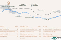In Gneixendorf, einer der beliebtesten Wohngegenden von Krems, wird exklusiver Wohnraum in ruhiger Siedlungslage realisiert. Durch die Nähe zum südlich gelegenen Stadtzentrum von Krems ist Gneixendorf besonders für Familien und Ruhesuchende interessant. Mitten im Grünen und trotzdem in nur wenigen Autominuten in der Kremser Innenstadt, wo durch die gebotene Infrastruktur (Schulen, Universitäten, Einkaufsmöglichkeiten, Krankenhaus, Kultureinrichtungen und Sportstätten) das Leben pulsiert. Atemberaubende Ausblicke auf das Stift Göttweig und das idyllische Donautal runden die Szenerie ab. Unweit von Gneixendorf erstrecken sich die weltberühmten Weingärten der Wachau - ein Paradies für jeden Weinliebhaber. Mit seinem vielfältigen Freizeitangebot vom Wandern über Fahrradfahren bis hin zu diversen Wassersportarten und seiner idyllischen Lage strahlt Krems ein exklusives und komfortables Lebensgefühl aus. Krems ist gut an das öffentliche Verkehrsnetz angeschlossen und bietet eine schnelle Bahnverbindung nach Tulln, Wien und St. Pölten. Mit der Bahn erreichen Sie innerhalb einer Stunde die Stadt Wien, St. Pölten ist mit der Bahn ca. 35 Minuten entfernt. Der Bahnhof Krems ist innerhalb von 8 Autominuten oder mit dem Bus in 10 Minuten von Gneixendorf erreichbar. Über die S5 bzw. die anschließende Autobahn A22 gelangt man bequem und in ca. 45 Autominuten nach Wien (P&R Heiligenstadt). Sankt Pölten erreicht man über die S5/S33 innerhalb von 25 Autominuten. Nach Tulln ist man ca. 30 Autominuten unterwegs.Beschreibung der Immobilie