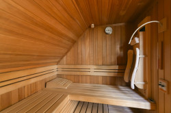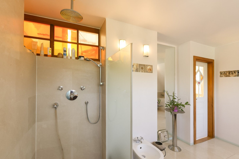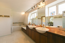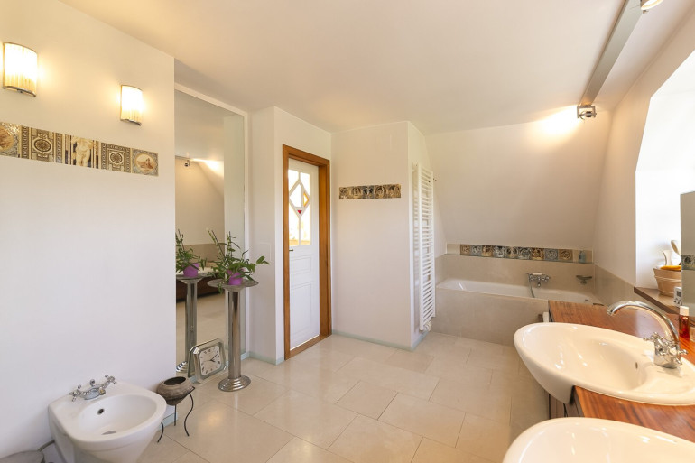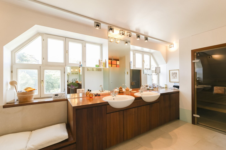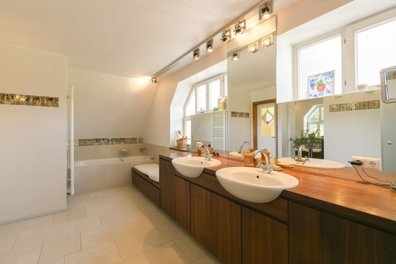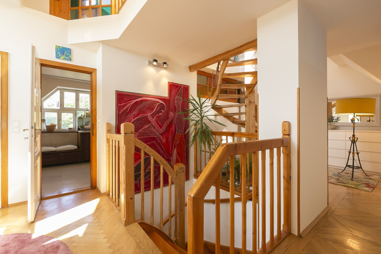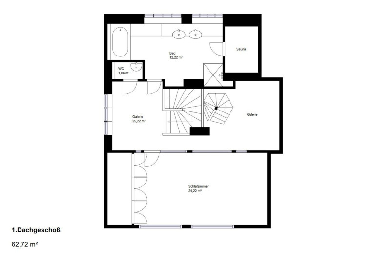 Schlafzimmer, Galeriebereich, Bad mit Wanne, Dusche, Fenster und Sauna, separates WC,
