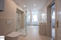 - modernes Badezimmer mit Doppelwaschbecken, Dusche und Toilette