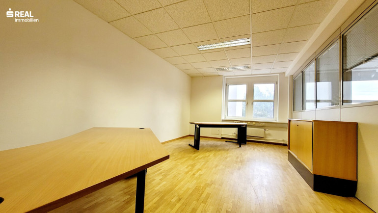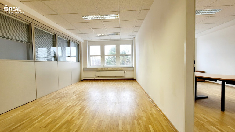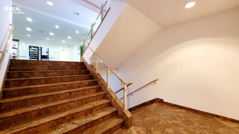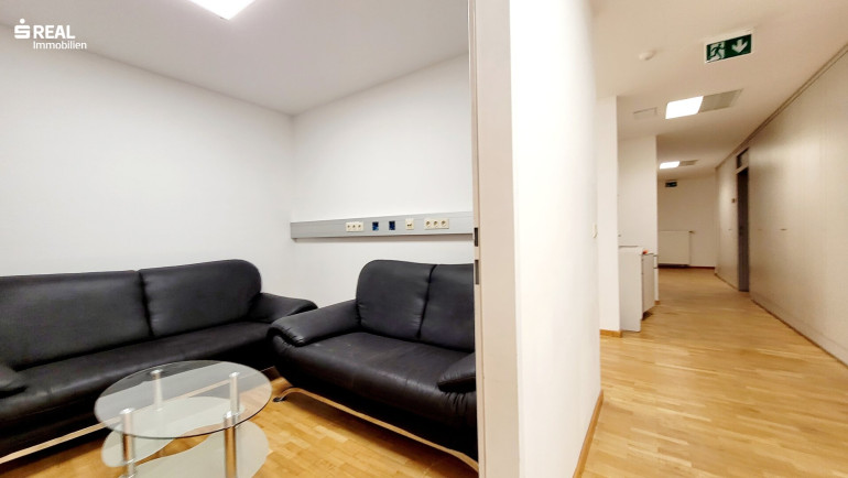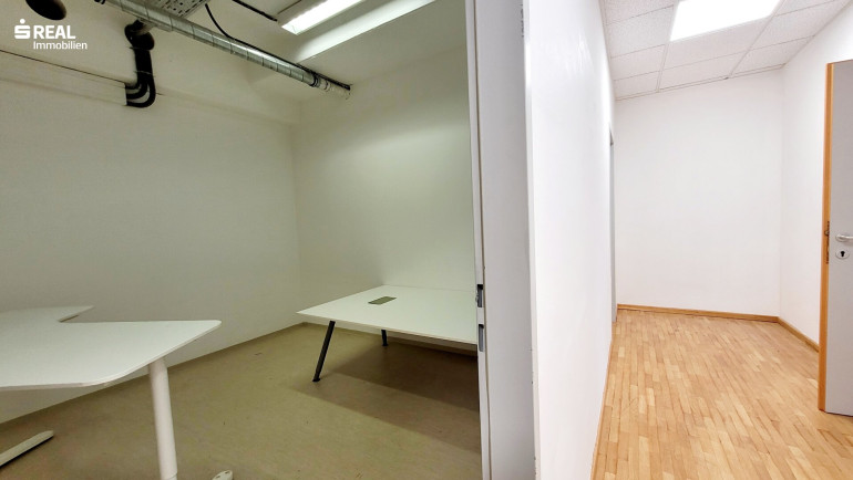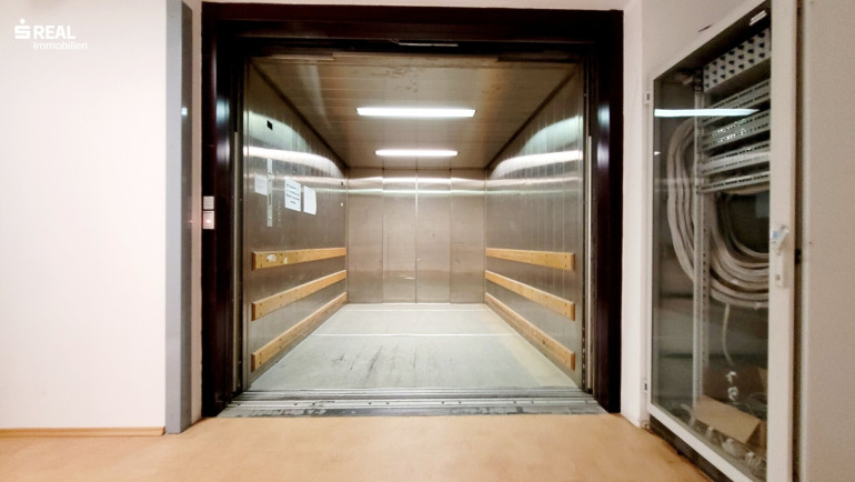 Die Büroräume liegen im 1.Stock – es gibt einen zweiten Ausgang über die Fluchtstiege zu den Parkplätzen im Hof. Der Lastenlift ist im 1. Stock im Bürobereich zugänglich.
