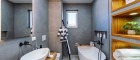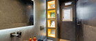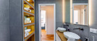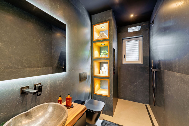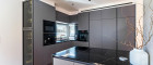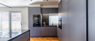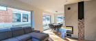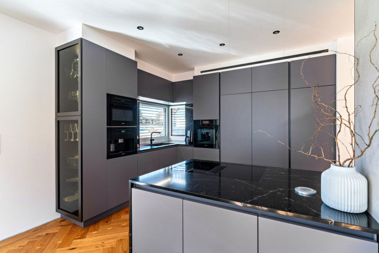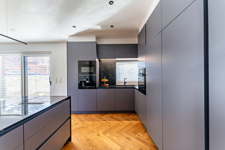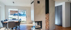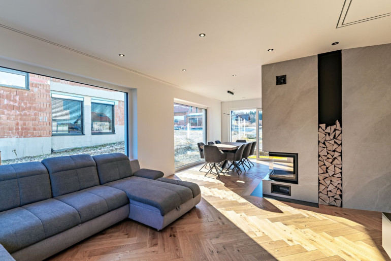 Das Herzstück des Hauses bildet die moderne, sehr elegant ausgeführte Einbauküche, die zum Wohnraum hin durch einen Kamin mit hinter Glas sichtbarem Flammenbild stilvoll separiert ist. Die Fußbodenheizung sorgt in allen Räumen für behagliche Wärme, beheizt über eine am Dach installierte Luft-Wärmepumpe.