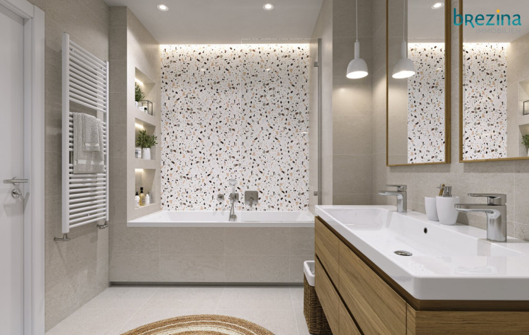 - 1 Badezimmer mit Badewanne, WC, Handtuchtrockner und Doppelwaschbecken – ca. 5,61 m2