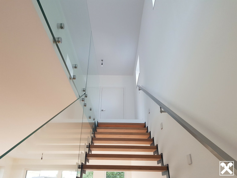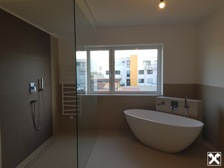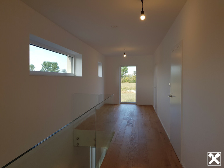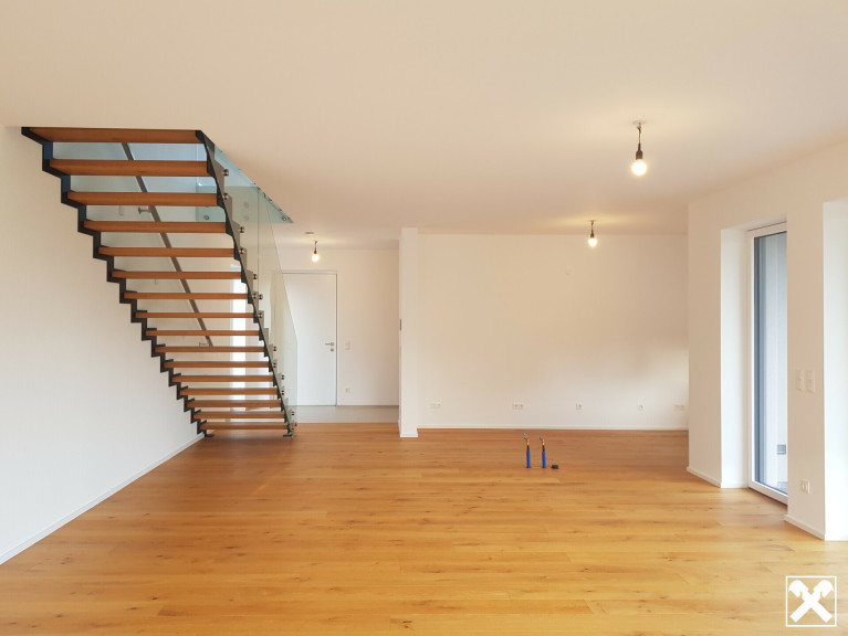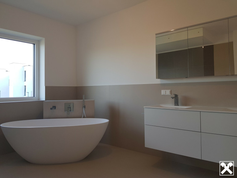 In den Wohnbereich integrierte, geschmackvolle, massive Stiegenanlagen mit Echtholz führen in den lichtdurchfluteten Galeriebereich des Obergeschosses mit vielen Glaselementen. Selbstverständlich sind auch auf der Schlafebene alle Räumlichkeiten zentral und separat begehbar. Sämtliche Wohnwünsche werden durch drei Schlafzimmer sowie ein Designer-Badezimmer mit frei stehender Badewanne, barrierefreier, großer Dusche, Doppelwaschtisch und ein WC erfüllt.