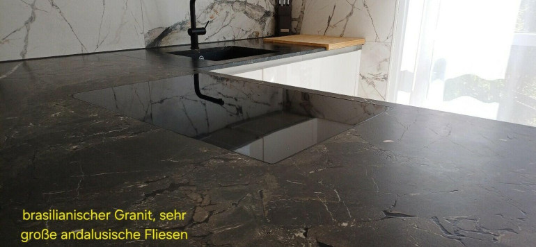 + Zu Mittag kochen Sie in Ihrer neuwertigen hochwertigen DAN- Einbauküche mit Arbeitsplatte aus brasilianischem Granit, großflächigen andalusischen Fliesen, Backen oder Dampfgaren in Augenhöhe, in Ihrer Traumküche mit phänomenalen Staumöglichkeiten.