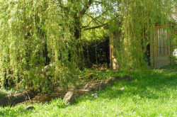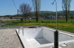 Vor dem Haus ein Swimmingpool mit einem kleinen Biotop und Gartenhäuschen.