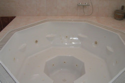 Wellnessbereich mit großen versenkten Whirlpool, Dusche, Sauna, Wirtschaftsraum, WC mit Pissoir.