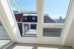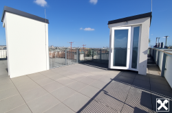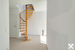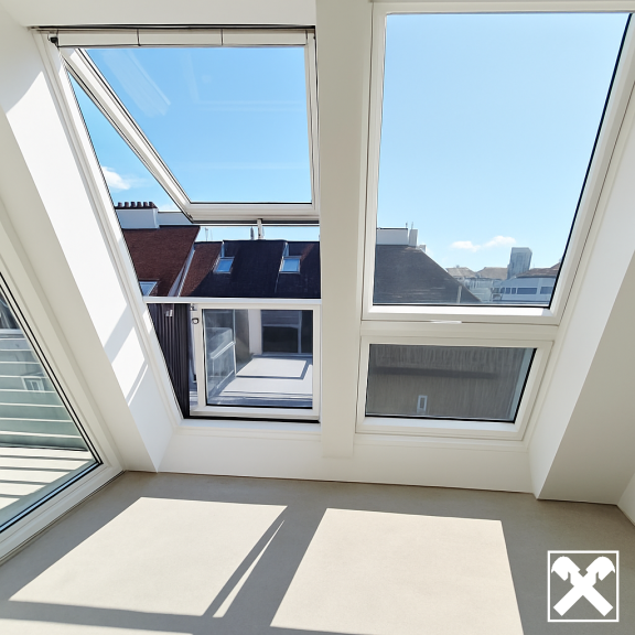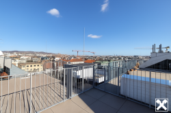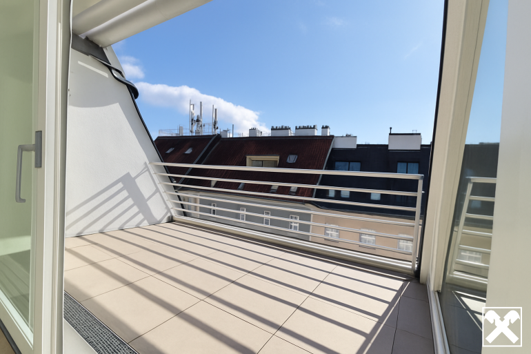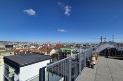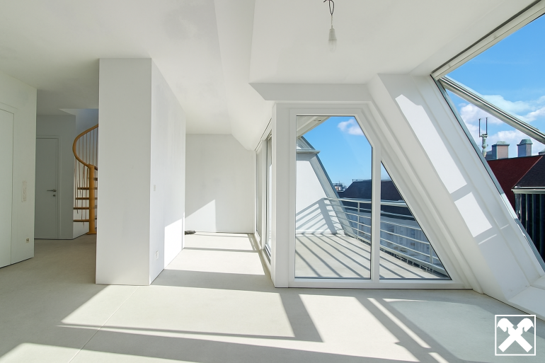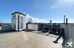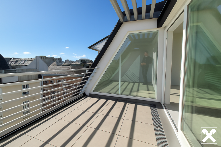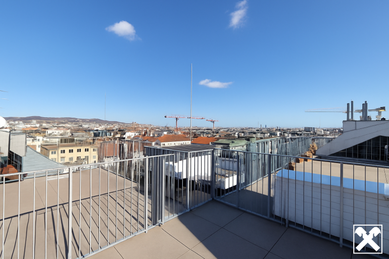 Über das Wohnzimmer gelangt man mittels einer Wendeltreppe auf die über der Wohnung liegenden ca. 34 m² großen Dachterrasse mit traumhaftem 360 Grad Rundblick über die Innenstadt bis zur Steinhofkirche sowie Kahlenberg und Leopoldsberg..