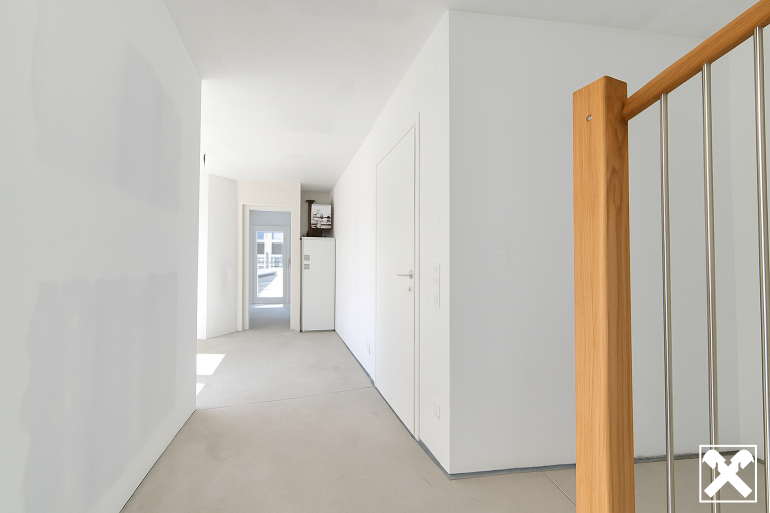 Man betritt sie über einen großzügigen Eingangsbereich, von dem aus das WC und die Treppe auf die Dachterrasse zugänglich sind und der in den fast 42 m² großen lichtdurchfluteten Wohnbereich mit offener Küche übergeht.