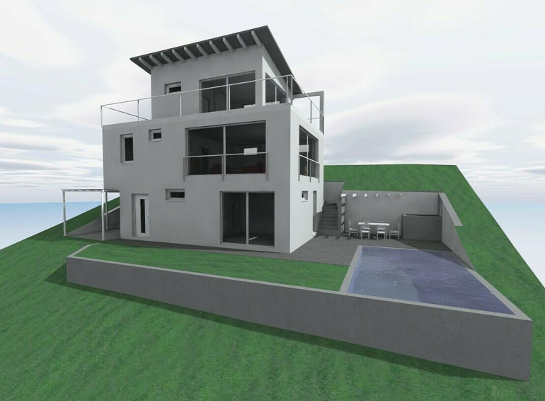 Zusätzlich gibt es eine gültige Baugenehmigung samt Planung für ein dreigeschoßiges Einfamilienhaus samt Pool und Autostellplätzen.