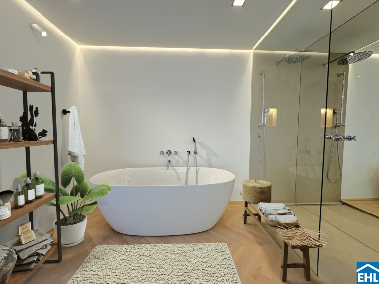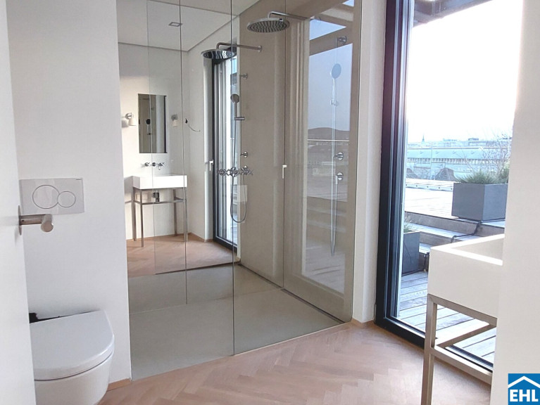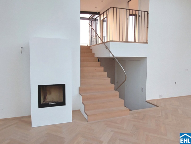 Hier erwartet Sie ein Wohntraum in exklusivem Ambiente. Die großzügige Wohnküche auf der unteren Ebene bietet viel Platz für leidenschaftliche Kochabende und gesellige Stunden mit Freunden oder der Familie. Der Raum wurde mit riesigen Fensterflächen ausgestattet, die einen malerischen Ausblick auf die Canisiuskirche bieten und für reichlich Licht und Sonne sorgen. Ein Kamin sorgt für eine gemütliche und behagliche Atmosphäre. Diese Ebene verfügt zudem über zwei Schlafzimmer, ein luxuriöses Badezimmer mit freistehender Wanne, großer Walk-in Dusche und einem Doppelwaschbecken, einem separatem WC, einem Abstellraum und einem Balkon. Vom Wohnzimmer aus gelangen Sie über eine elegante Treppe ins Obergeschoss. Hier befinden sich ein weiteres exklusives Schlafzimmer und ein zweites Badezimmer mit Dusche und WC. Großflächige Hebe-Schiebetüren gewähren Zugang zur über 60 m² großen Terrasse, die eine spektakulären Blick über Wien bis hin zum Kahlenberg bietet.