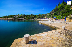 Über eine Treppe gelangen Sie von der Terrasse aus direkt zum Strand, welcher hauptsächlich von Hausgästen genutzt wird. Eine Badebucht mit sauberem Wasser und einem ruhigen Badestrand, umgeben von üppigem Grün, und das direkt vor dem Hotel. Was will man „meer“. Der flachabfallende Strand ist ideal für Kinder, das Novigrader Meer ist ein wahres Surf- und Wasserskiparadies.