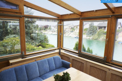 Traumhaftes Einfamilienhaus am See auf Pachtgrund ■ Großzügiges Wohnzimmer mit Kachelofen und Wintergarten mit Seeblick Ihr Zuhause am Wasser! |